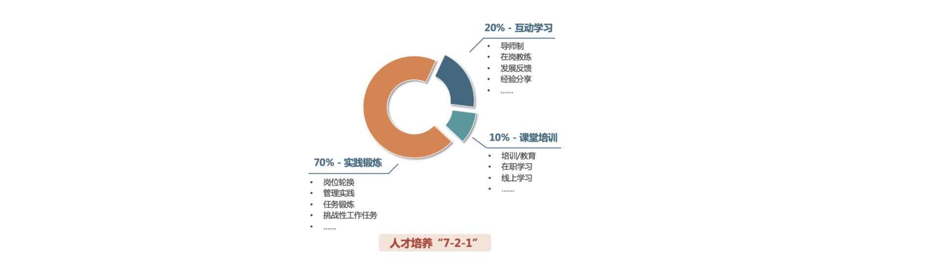 根据人才培养的最佳实践——人才培养721模型,各种人才培养方式,在人才培养过程中所能够起到的作用不同。按照721的模式进行培训,可以大幅提高了学习的效率,加速人才成长的步伐。