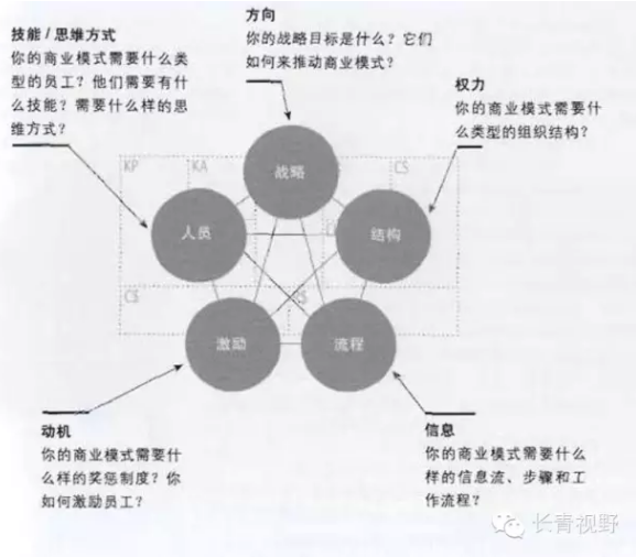 为把可行的商业模式转化成为一家可持续发展的公司,高林世纪在书中还给出了一个融入商业模式画布的星型模型(图二)。这个模型的五角分别是公司需要平衡管理好的5大要素,即战略、组织结构、业务流程、激励和人员,而商业模式位于星型模型的中心位置,是平衡5大要素的“重心”。除高林世纪在书中指出的模型用途外,我个人认为,这个模型可作为诊断和分析一家企业能否可持续成长的整合性、结构化思考工具。通过对一家企业商业模式演变和5大要素的分析,将使我们更加清晰地捕捉一家企业过去、现在和未来的关键成功因素,能够帮助我们更系统地认识一家企业管理变革的必要性和方向。