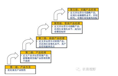 归纳起来,产品经理的成长路径大致可以划分为如下五个层级。换句话说,产品经理的能力水平也就可以区分为如下五个等级。