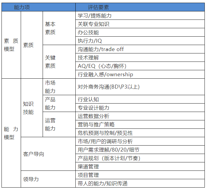 微信某篇文章也阐述过腾讯的产品经理能力素质模型,大致的模型框架如下表所示: