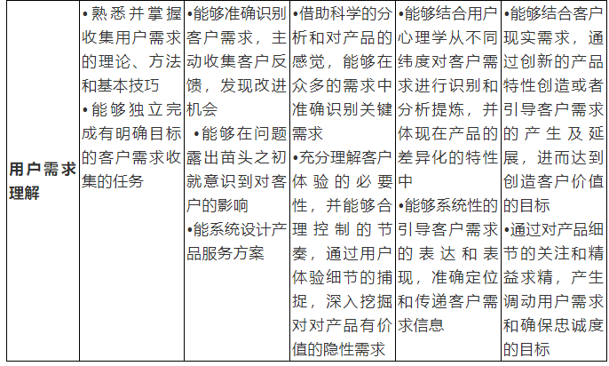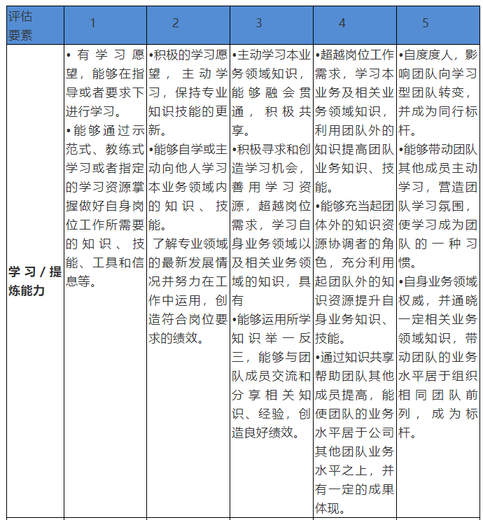 按胜任力模型的通用开发模式:“评估要素”的每个项首先进行5级分级定义,这里以“学习/提炼能力”和“用户需求理解”为例:
